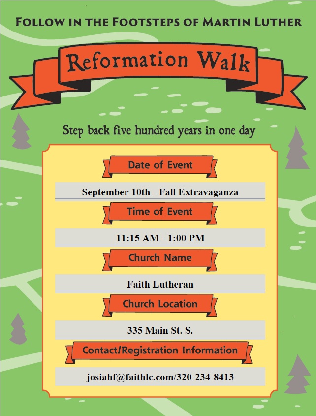 This annual event is always a family favorite with activities for all ages including games (don’t miss the cake walk), food, bouncy houses, a registration table for Sunday School Students, and new this year ~ a Reformation Walk that will take a step back 500 years for a walk in the footsteps of Martin Luther.